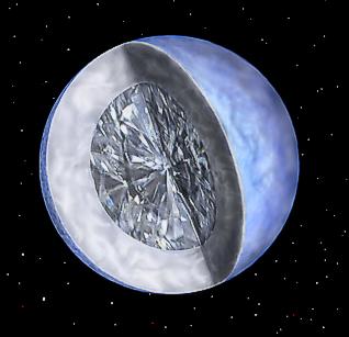 O gigantesco diamante é a forma final que uma estrela como o Sol adquire após passar por um longo ciclo evolutivo (veja o esquema ao lado). O carbono formado pelas reações nucleares do astro acumulam-se em sua região central. Compactado por uma pressão descomunal, o material organiza-se em rede cristalina, dando origem ao diamante. O astro é realmente uma jóia de valor incalculável. Mas, para quem já está pensando em como chegar lá para obter um pedaço, fica aqui o alerta: apesar de ter-se resfriado muito, a estrela ainda é mais quente do que a superfície do Sol e sua extraordinária força gravitacional esmagaria qualquer objeto que se aproximasse demais dela.